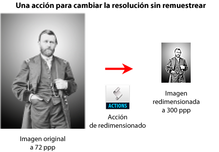 Hay varios modos de automatizar un trabajo en Photoshop. El más básico es hacer una acción, la grabación de una secuencia de cambios sobre una imagen para poder repetirla sobre cualquier otra imagen a la que se aplique. Es la forma más sencilla de automatización que se puede hacer —es el equivalente de un macro de los programas de ofimática—. No todos los cambios y operaciones que se hacen en Photoshop se pueden grabar dentro de una acción. Si no se usan scripts —que funcionan sobre una base distinta—, cualquier cambio automático pasa siempre por una acción.