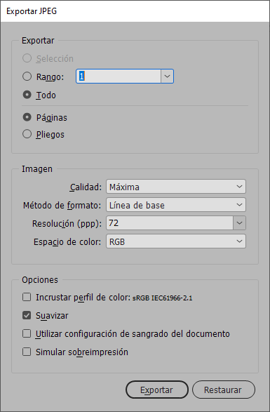 Ocultamos la capa "imagen", con lo que sólo quedará visible la capa "texto", y vamos al menú "Archivo – Exportar". Elegimos el formato PNG con los parámetros que ves más arriba en lo que se refiere a resolución (72 ppp), espacio de color (RGB), "Fondo transparente" y "Suavizar" (esto es para que el texto no salga con bordes ásperos).
