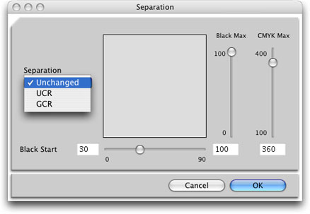 Para la conversión de RGB a CMYK, el perfil devicelink creado por ProfileMaker manda RGB 0/0/0 como CMYK 0/0/0/100. Si los dos límites totales de tinta implicados son distintos se puede (más bien se debe) elegir una nueva "Separación UCR" o "CGR".