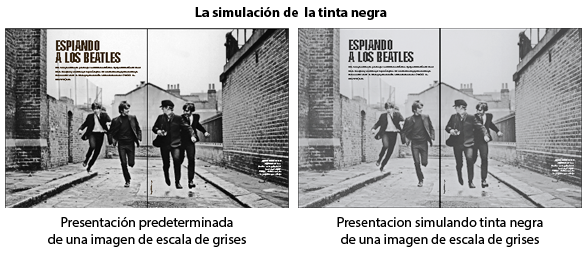 Sin embargo, eso no quiere decir que la gestión del color de InDesign no afecte a los objetos en escala de grises, sino que lo hace de forma poco intuitiva e indirecta al afectar a la presentación de la tinta negra, identificada por la muestra predefinida llamada "[Negro]". Los elementos nativos en escala de grises se ven afectados del mismo modo.