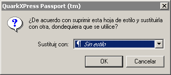 Si las hojas elegidas estuvieran en uso en algún sitio del documento que tuvieramos abierto, Quark XPress nos ofrece la posibilidad de "Sustituir" la hoja de estilo que desaparece y nos ofrece ese cuadro de diálogo con las hojas de estilo que aún permanecen.