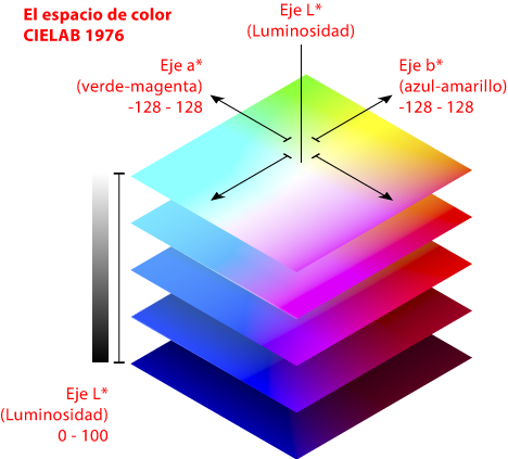 Tiene tres componentes: L*, a* y b* (el asterisco indica que se trata de un espacio de color Lab de la CIE para distinguirlo de otros espacios Lab). Todos ellos se gradúan de 0 a 100 (no se admiten valores negativos). L* es el canal de la luminosidad acromática; a*es el canal de variación cromática entre verde y rojizo y b* es el canal de variación cromática entre azulado y amarillo.