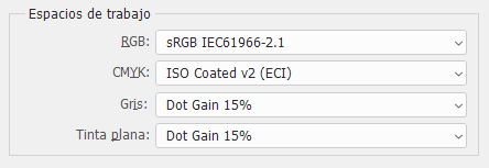 Al abrir la administración de color de Adobe Photoshop en el menú "Edición - Ajustes de color", el programa presenta como predeterminados cuatro perfiles de color ("RGB", "CMYK", "Gris" y "Tinta plana") para usarlos como “espacios de trabajo” (colour working spaces). Estos perfiles son esenciales para tratar los colores, por lo que es importante elegirlos correctamente.