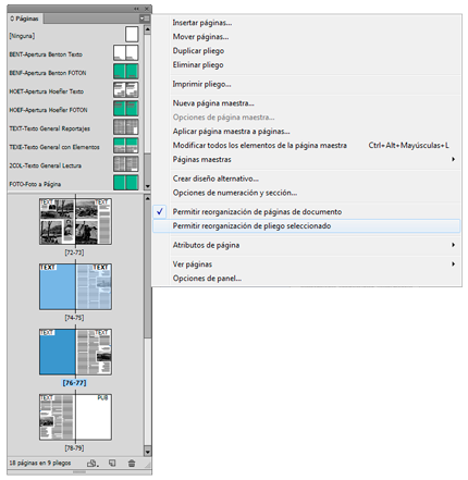 Advertencia: para poder duplicar las dobles páginas —que en InDesign traduce erróneamente como pliegos—, debe estar marcada la opción "Permitir reorganización de páginas de documento" y sin marcar la otra llamada "Permitir reorganización de pliego seleccionado"